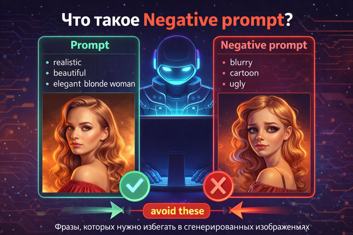 Negative prompt — это список того, чего нейросети НЕ нужно делать. Если основной prompt говорит: «Сделай вот так красиво» то negative prompt говорит: «Только, пожалуйста, НЕ делай вот это» Примеры, зачем он нужен: Нужно ли его вставлять в окно запроса? - Зависит от нейросети! ➡️ ДА, обязательно Тогда: -- no: blurry, plastic skin, distorted face, low resolution, AI artifacts или avoid: cartoon, over-smooth skin, bad anatomy Работает чуть слабее, но всё равно лучше, чем ничего. Потому что нейросеть: Negative prompt буквально держит её за руку и говорит: «Стоп. Реализм. Не фантазируй.» Минимальный универсальный negative prompt, одна строка, без лишнего 👌