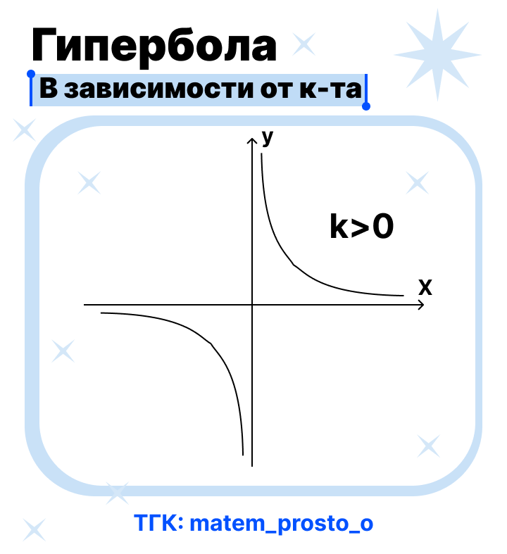 Гипербола — это график функции вида y = k/x, где k ≠ 0 (k — константа, число). Проще говоря: две кривые-ветви, которые никогда не касаются осей координат. Они словно убегают от них навсегда. Как выглядит и почему? 👀 Запомни образ: Это обратная зависимость. Чем БОЛЬШЕ x, тем МЕНЬШЕ y (и наоборот). Поделили фиксированное число k на разные величины. Ключевые свойства 📊 ✔️ Область определения: x — любое число, кроме нуля (на ноль делить нельзя!). D(y): x ∈(-∞; 0) ∪ (0; +∞).