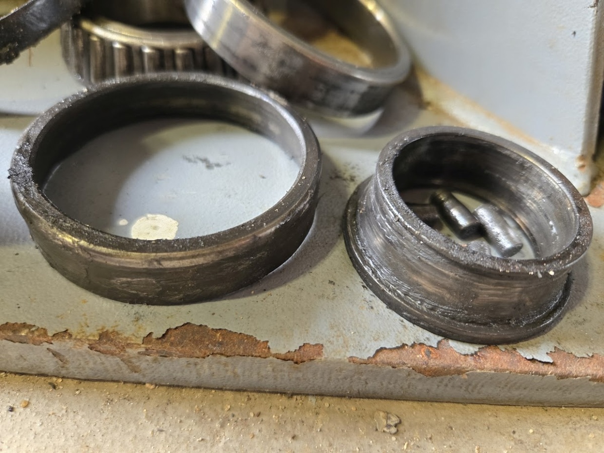 Однако возникла новая проблема: развалившийся подшипник повредил саму ступицу: болтающиеся ролики "проели" в ней канавку. Соответственно, новый подшипник не получалось качественно запрессовать в ступицу: он в ней болтался. А новой ступицы, конечно же, в наличии не было. Мастер сначала поехал к токарю, чтобы наварить металла в ступицу сваркой, а потом проточить - и, тем самым, восстановить. Через некоторое время вернулся и развёл руками: ступица чугунная, к ней ничего не приваривается. Тогда он стал восстанавливать внутреннюю поверхность ступицы медной проволокой: то ли приваривал её, то ли припаивал - а потом протачивал, удаляя лишнее. Мастер сразу сказал, что это временное решение: только чтобы доехать до дома. Потом нужно будет менять саму ступицу на новую.