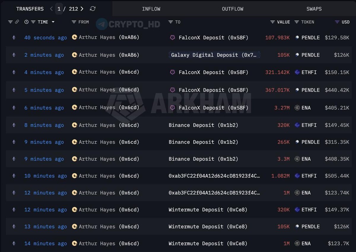 🥵 Артур Хейс полностью закрыл позиции по четырем DeFi-токенам в минус (Arkham