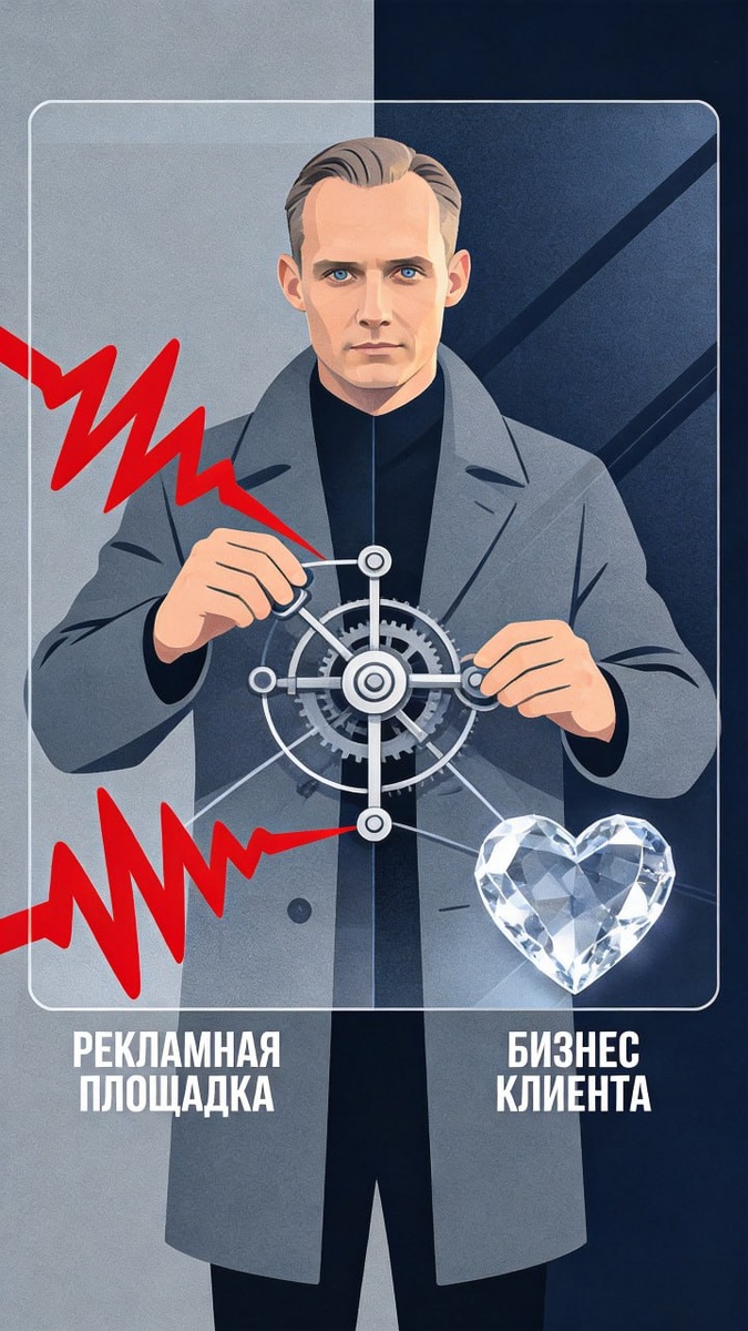 "Маркетологу приходится быть не только психологом и тренером по мотивации для своих клиентов, но и дипломатом, и арбитром. Дипломат-арбитр, который "хранит секреты" обеих стороны ("клиента" и "рекламных площадок"). Маркетолог, этакий работник "серого плаща", выступает на одной стороне, чтобы не возникло агрессии от "клиента" из-за частого несовершенства работы рекламных алгоритмов, вкупе с необоснованно завышенными расходами "рекламных бюджетов". На другой стороне, чтобы "рекламные площадки" не узнали "лишней" информации, связанной с финансовыми возможностями "клиента", которые могут быть использованы "против него". Поэтому справедлив тот факт, что стоимость услуг профессионального маркетолога должна быть достаточно высока. Высока, чтобы позволить ему тратить время не только на прямые обязанности рекламного "стратега и тактика", но и на дипломатическое общение с обеим сторонами в формате третейского суда. Только такой маркетолог, как серый кардинал (описываемый выше), может обеспечи
