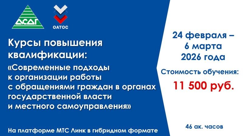 🟩🟩🟩🟩🟩 24 февраля - 6 марта 2026 года – пройдет курс повышения квалификации по образовательной программе «Современные подходы к организации работы с обращениями граждан в органах государственной власти и местного самоуправления» 🅰️🅰️🅰️🅰️🅰️🅰️❗️ ⚡️ Ассоциация сибирских и дальневосточных городов (АСДГ) приглашает Вас на курсы повышения квалификации, разработанные для депутатов представительных органов муниципальных образований, руководителей и специалистов органов государственной власти и местного самоуправления, а также предприятий и организаций, работающих с обращениями граждан. Данный курс состоит из серии видеолекций, практических заданий и двух практических вебинаров. ⚡️ Продолжительность курса: 46 академических часов 💳 Стоимость обучения: 11 500 рублей ▶️ Эксперт-преподаватель курса - Александр Савоськин, доктор юридических наук, заведующий кафедрой конституционного и международного права Уральского государственного экономического университета. 💻 В гибридном ф