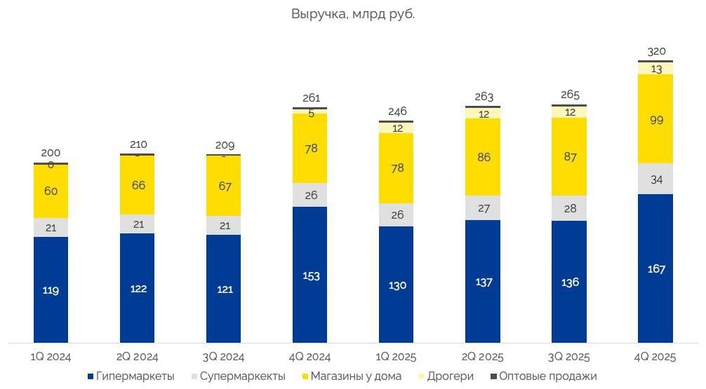 ? Еще в апреле прошлого года добавляли эту бумагу в портфель и неоднократно писали, что Лента — наш фаворит в секторе. Вот несколько обзоров отчетов на этот счет: раз, два, три. И кто покупал бумагу в то же время, сейчас уже может задуматься: а не стоит ли зафиксировать прибыль? Ну а мы, как и обычно, смотрим на отчет и делимся своим мнением. Лента увеличила выручку на 22,4% по итогам IV кв. и на 24,2% по итогам 12 мес. 2025 г. Компания торгуется на уровне коллег по цеху и эффективно использует денежные потоки для M&A розничных сетей. За 2025 год компания приобрела сети Spar и Реми. Выручка группы выросла на 24,2% год к году – до 1,1 трлн руб. Активнее всего растут магазины у дома (Монетка) – до 350,8 млрд руб. (+29%) и супермаркеты – до 116,5 млрд руб. (+29,1%). Отметим рост по всем направлениям: – Открытие новых магазинов (более 1400 магазинов за 12 месяцев); – Рост среднего чека на 9,3%; –Повышение трафика на 1%. В IV квартале ситуация аналогичная, основные драйверы роста –