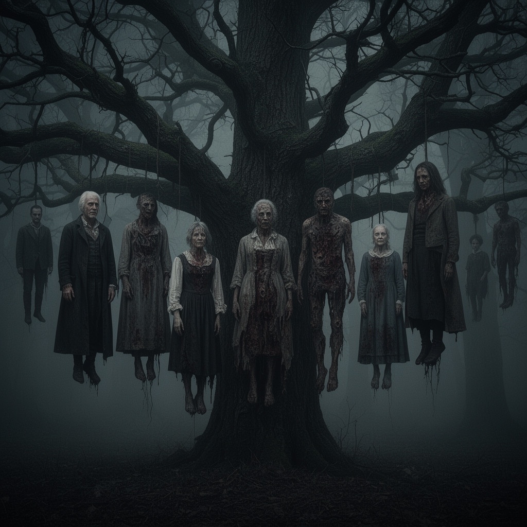 Такие разные, и такие... мертвые. Вот мужчина в укороченной кожаной куртке, лицо синее, но ещё не сильно тронутое разложением. Чуть дальше — женщина в платье в цветочек, похожем на бабушкино, из восьмидесятых, лицо истлело настолько, что невозможно было что-то на нем разглядеть или определить ее возраст. А там старушка в вязаной кофте и плиссированной длинной юбке, в цветастом платочке, из под которого свешивались седые свалявшиеся пряди. А еще — скелеты, обтянутые тряпьем, колышащиеся на ветру с тихим, костяным перезвоном. А в самой гуще крон, там, где свет едва пробивался, темнели высохшие, почти чёрные мумии, сохранившие форму тел и гримасы последнего ужаса.