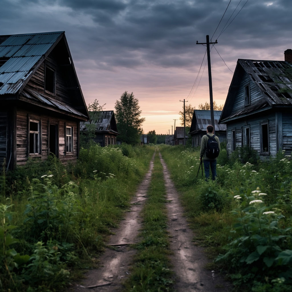 Дорога заняла почти двое суток: сначала поезд до Перми, потом перекладные маршрутки и, наконец, семикилометровый пеший марш‑бросок по заросшей лесной тропе. К вечеру третьего дня Артём добрался до деревни. Перед ним раскинулась картина тотального запустения: покосившиеся избы с выбитыми окнами, провалившиеся крыши, заросшие бурьяном огороды. Ни дыма, ни голосов, ни даже лая собак. Только ветер шелестел высохшей травой и скрипел остатками ставен.