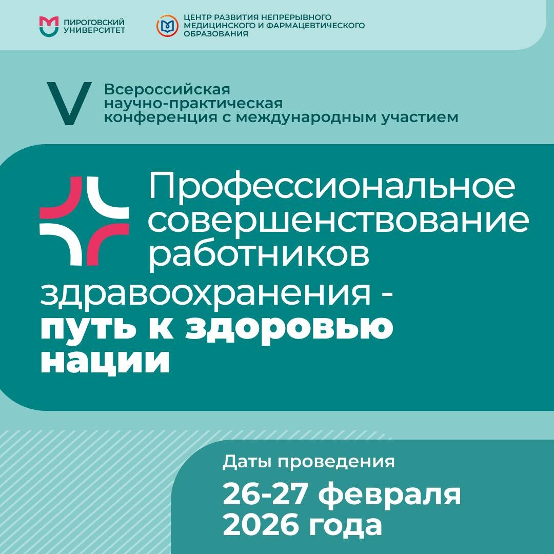 ! Российский национальный исследовательский медицинский университет им. Н.И. Пирогова приглашает вас принять участие в V Всероссийской научно-практической конференции с международным участием «Профессиональное совершенствование работников здравоохранения — путь к здоровью нации». Основной задачей конференции является создание площадки для трансляции передового опыта и обмена мнениями всех участников образовательного континуума для работников здравоохранения с целью повышения качества и эффективности их профессионального и личностного развития. 📅 Даты проведения: 26-27 февраля 2026 года. 📍 Место проведения: г. Москва, ул. Островитянова, д.1, стр. 7. Схема проезда. Ниже вы можете ознакомиться с расписанием Первого дня конференции: 🔹 10:00-12:00 (МСК) - ПЛЕНАРНОЕ ЗАСЕДАНИЕ 🔹 13:00-15:00 (МСК) - Панельная дискуссия: "От лаборатории к клинической практике: интеграция науки в здравоохранение и образование" 🔹 13:00-15:00 (МСК) - Секционное заседание: «Роль образовательных, медицин