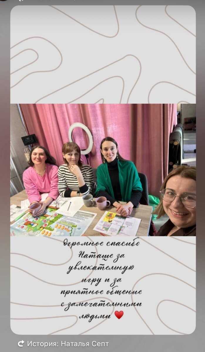 Я легко переключаюсь и, несмотря на подготовку к переезду (ура, мы вчера переехали из дома в квартиру 🔥), с удовольствием провела Т игру Самосаботаж в субботу. Какие невероятные девочки подобрались, у меня восторг от вашей глубины и уровня нашего взаимодействия. Т игры я провожу по запросу. Что это значит? Либо я приезжаю и провожу игры для ваших компаний. Либо мы выбираем с клиентом день, время и место и я зову других участников. Обычно провожу игры от 2 участников. Про Т игру Самосаботаж: https://t.me/natapourlame/1060 https://dzen.ru/media/natapourlame/transformacionnaia-igra-samosabotaj-v-moskovskom-raione-spb-est-jelanie-66b543f1c4f43a1b1a5050f3 PS: В апреле я планирую вести еще одну игру - Очередь из денег, лист предзаписи уже веду.🤩 #играсамосаботаж #отзывы