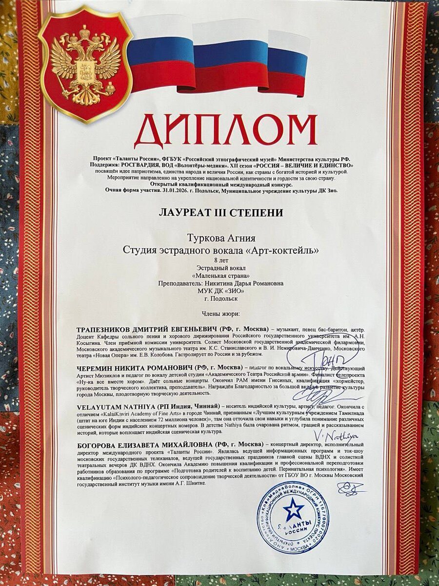 » 31 января воспитанники студии эстрадного вокала «Арт-коктейль» ДК ЗИО блестяще выступили на Международном конкурсе «Таланты России». 🏆 Лауреаты I степени: • Никитина Дарья • Канниева Динара • Дуэт Никитина Дарья и Величко Дарина 🥈 Лауреаты II степени: • Величко Дарина • Губина Елизавета • Чмуров Григорий 🥉 Лауреат III степени: • Туркова Агния Поздравляем наших талантливых вокалистов и педагогов с выдающимися достижениями! #ДКЗИО #АртКоктейль #ТалантыРоссии #Конкурс #Вокал #Награды #Подольск