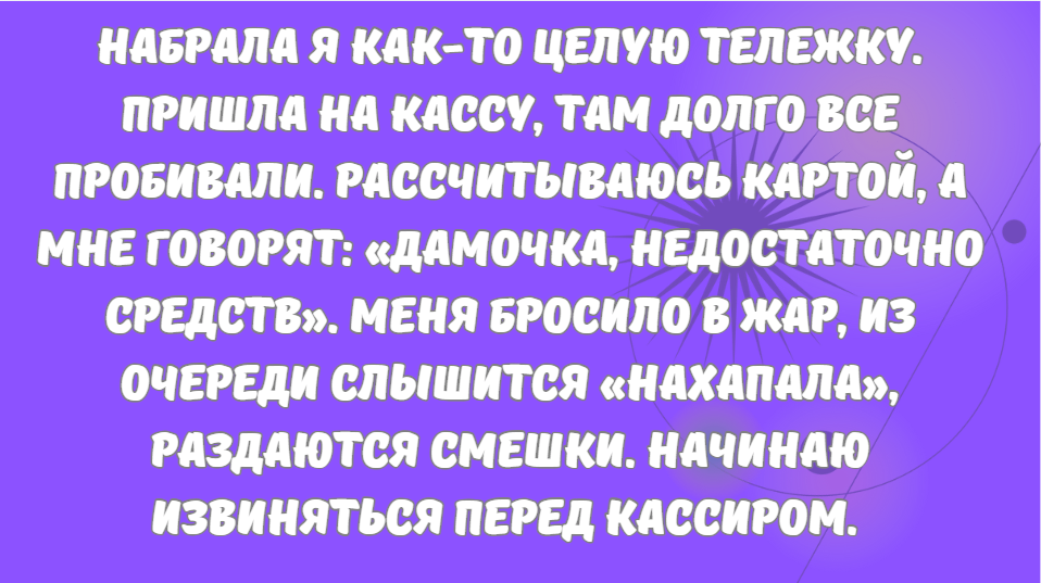 - Набрала я как-то целую тележку. Пришла на кассу, там долго все пробивали. Рассчитываюсь картой, а мне говорят: «Дамочка, недостаточно средств». Меня бросило в жар, из очереди слышится «нахапала», раздаются смешки. Начинаю извиняться перед кассиром. И тут подходит какой-то мужчина из толпы и оплачивает мне покупку. Спасибо доброму человеку! © tua_anesthesia