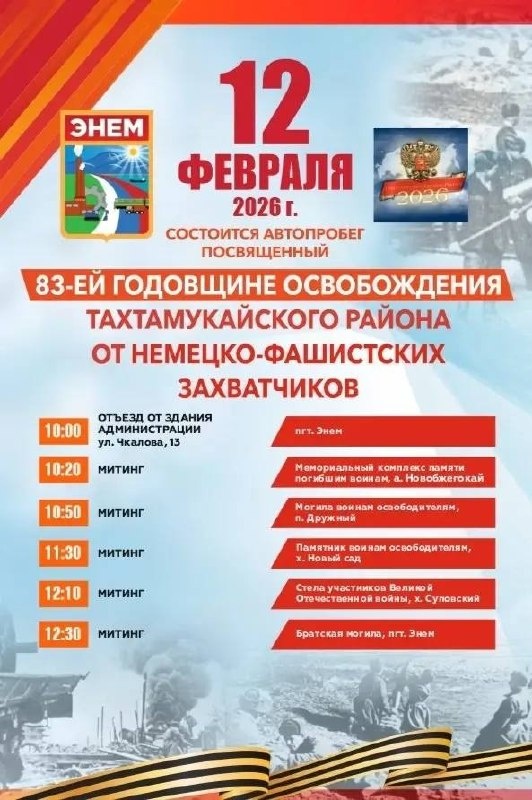 !!! 12 февраля состоится АВТОПРОБЕГ ПО МЕСТАМ БОЕВОЙ СЛАВЫ, приуроченный к 83-й годовщине со дня освобождения Тахтамукайского района и поселка Энем. Сбор автоколонны в 10:00 У здании администрации по адресу: ул.Чкалова 13. Маршрут движения автоколонны: а.Новобжегокай п.Дружный, х.Новый Сад, х.Суповский. Завершится автопробег митингом у Братской Могилы 65 советских воинов в 12:30, в пгт.Энем.