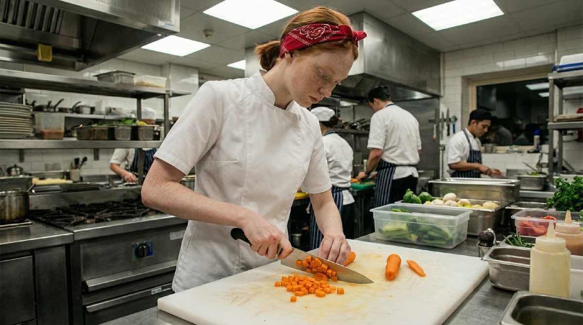 Форма визуально показывает: здесь есть стандарты. Даже если кухня закрытая, персонал всё равно на виду: Гость считывает внешний вид моментально.