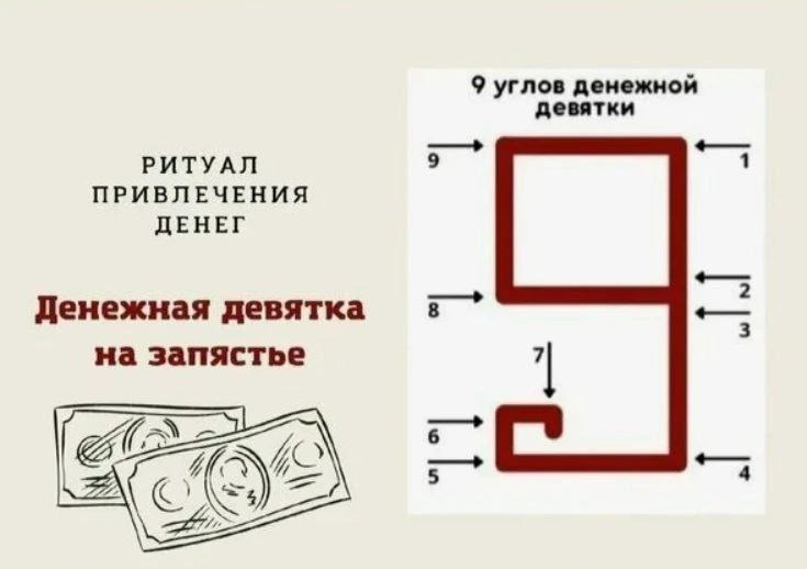 ! А это значит что? Пришло время рисовать Девятку на руке! Что нужно сделать❓ 👉Сегодня, 9 числа, в любое время, когда вы увидите 9 на часах, нужно нарисовать на запястье Девятку. 👉Да не простую Девятку, а с девятью углами. Рисовать рекомендуют с хвостика. 👉Правшам на левой руке, левшам – на правой. Цвет большой роли не играет. Чем писать – тоже. 👉Важнее наше намерение! Просто настройтесь на позитив, представьте какой-нибудь эпизод из будущего, где вы можете позволить все, что хотите и проговорите что-нибудь типа: 💫Я живу в достатке и изобилии; 💫У меня всего всегда достаточно; 💫Деньги приходят ко мне легко из разных источников; 💫Я люблю деньги и деньги любят меня… И пусть у всех всегда будет достаточно денег и возможностей жить богато и счастливо!💰
