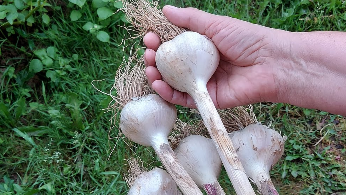 Зрелость чеснока видно. Нижние листья желтеют, стрелки выпрямляются, чешуя становится плотной. Это сигнал. Не раньше и не позже.