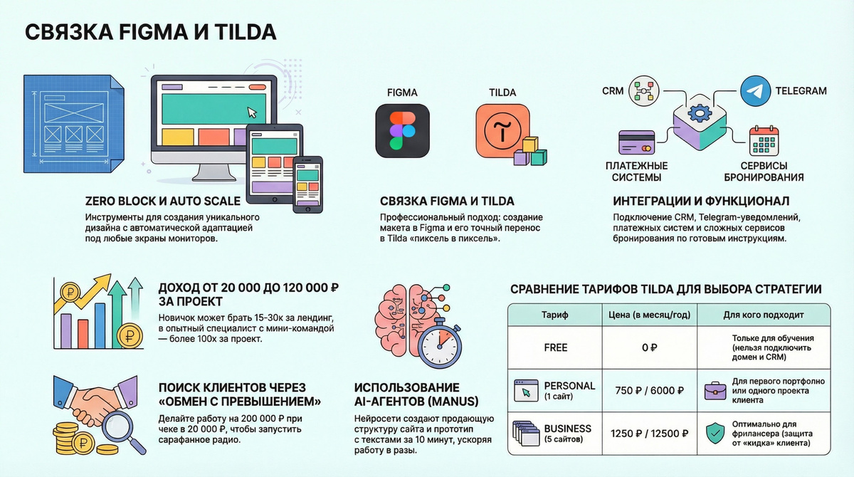 2. Zero Block (Нулевой блок): Если вы хотите зарабатывать, забудьте про стандартные блоки. На них сайты делают сами клиенты, чтобы сэкономить. Профессиональный веб-дизайн на Тильде делается в Zero Block — редакторе, где вы с нуля создаете дизайн.