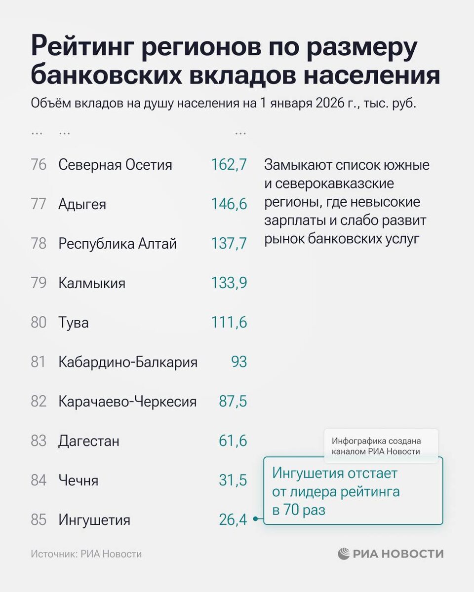 общероссийском рейтинге. Лидируют по размеру вкладов Москва (1,8 млн рублей на человека), Санкт-Петербург (1 млн) и Ненецкий автономный округ (735 тыс.). В конце списка — регионы Северного Кавказа: Дагестан (61 тыс.), Чечня (31 тыс.) и Ингушетия (26 тыс.).