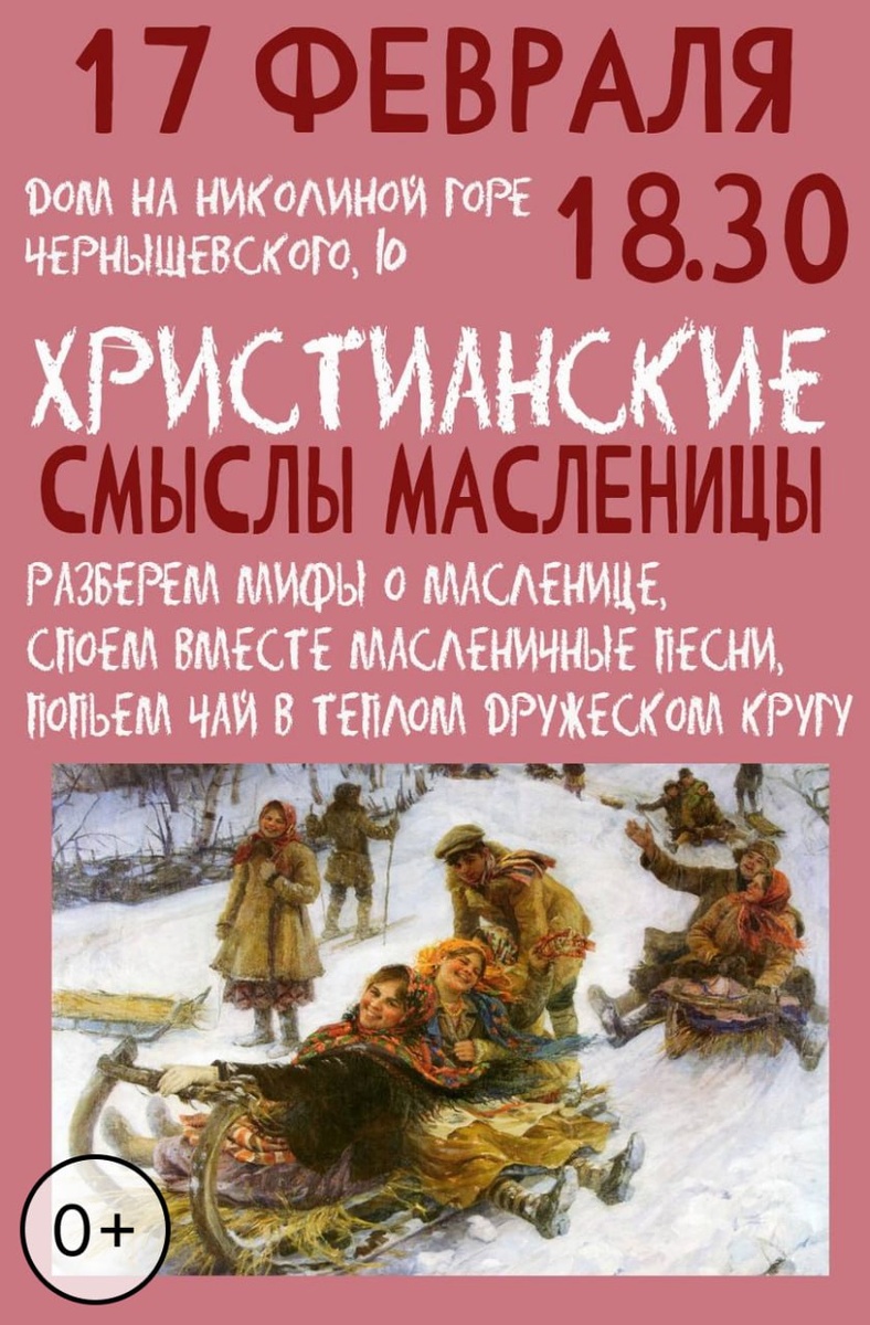 ! 🍂🍂 Приглашаем вас в Дом на Николиной горе (ул. Чернышевского, 10) на тёплый семейный вечер с дружеским чаепитием ☕️ и нашей необычной христианских смыслах Масленицы! Вход свободный, но очень просим приносить блины, пироги и другие вкусняшки для общего стола 🥐🍎. 🔆 Обычно Масленица воспринимается как древний языческий праздник, превращённый церковью в христианский. Но на самом деле за многовековой историей скрывается гораздо больше: праздник вобрал в себя живые языческие традиции и христианские смыслы, создавая уникальную народную духовность. 🔆 За последние пару столетий вокруг Масленицы накопилось множество мифов и стереотипов, которые мешают правильно понять её истинное значение. Мы приглашаем взглянуть на праздник с неожиданной стороны — через призму христианства. 🔆 В крестьянской традиции Масленица была попыткой вернуть райское состояние хотя бы на одну неделю. Русский человек, по Достоевскому, жил христианской жизнью не только в храме, но и вне его, а центр этой жизни
