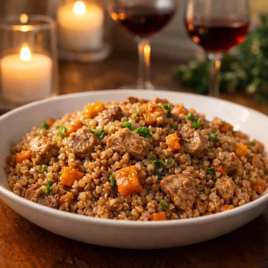 - Обжариваем еще пару минут все, и добавляем промытую гречку.