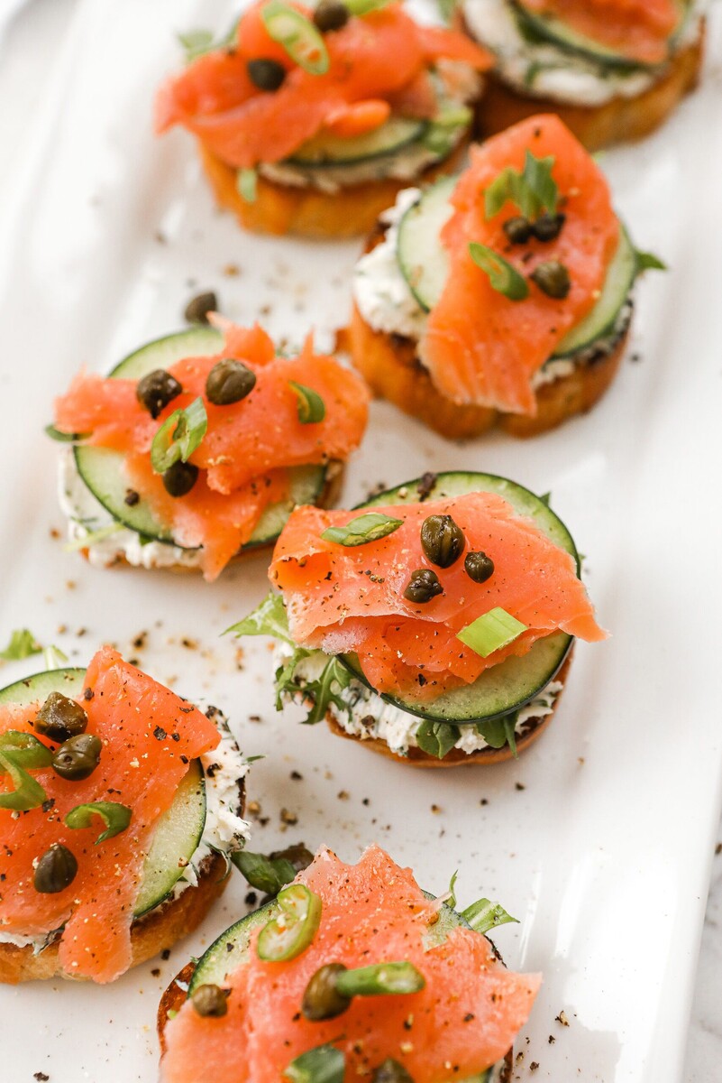1. Закуска: Кростини с крем-сыром, лососем и огурцом