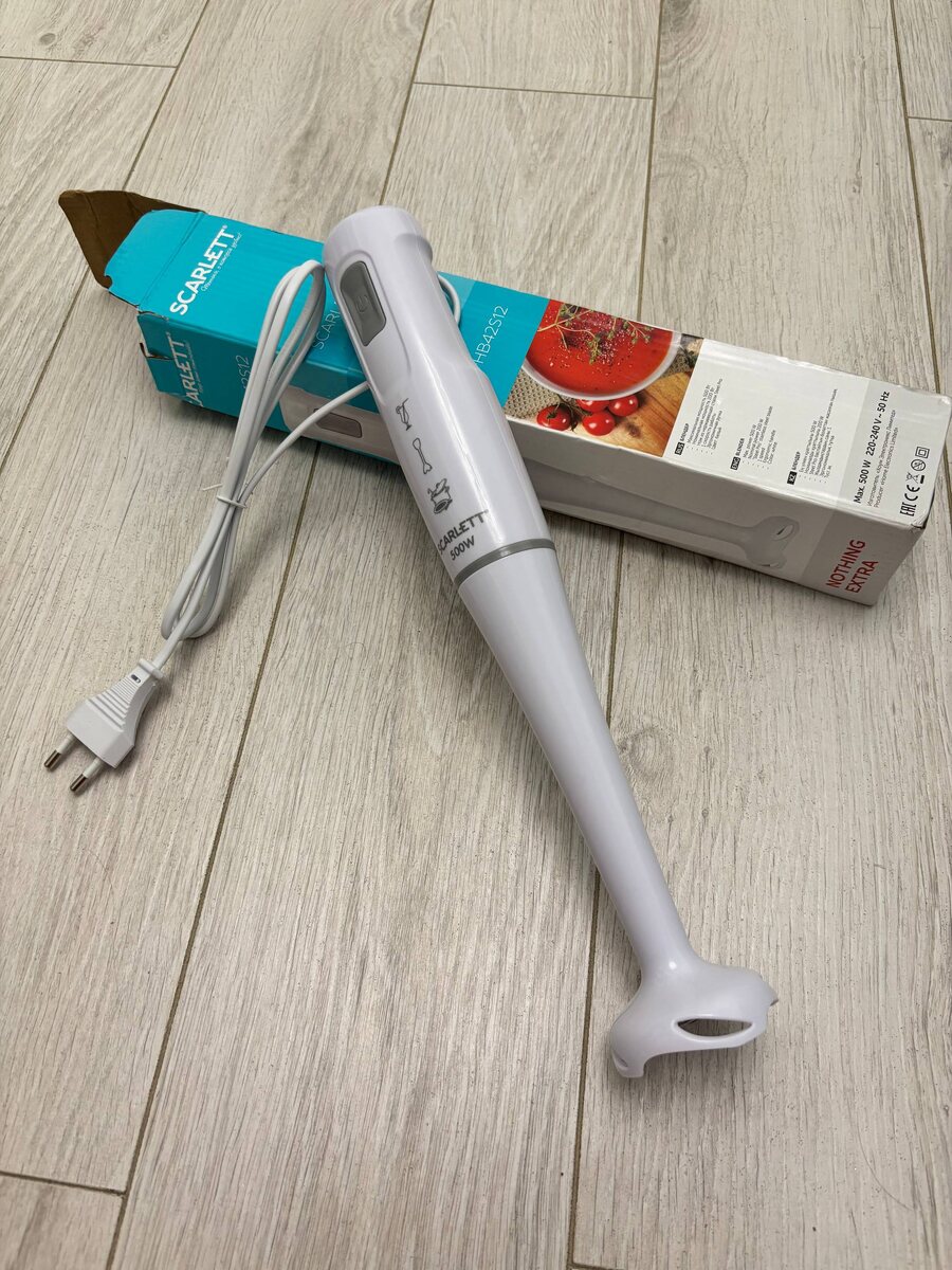 Привет! Решил упростить себе жизнь на кухне и заказал на Озоне погружной блендер SCARLETT SC-HB42S12. Доставка до ПВЗ заняла стандартные четыре дня, без сюрпризов. Коробка приехала немного помятой по углам, но сам прибор был цел. Упаковка простая, картонная, с изображением блендера и основными характеристиками: мощность 500 Вт, скорость 13000 об/мин. Внутри, кроме самого блендера, нашел только гарантийный талон и инструкцию на русском языке – ничего лишнего. Дизайн блендера – классика: белый корпус с серой кнопкой, выглядит просто, но аккуратно. Собирается легко, щелчком. В руке лежит удобно, не тяжелый. Пластик погружной части почти без запаха, что порадовало – не пришлось мыть с уксусом перед первым использованием, как это бывает с некоторыми бюджетными моделями. В общем, внешне – скромный, но симпатичный гаджет. Теперь к делу. Управление здесь проще некуда – одна кнопка, без скоростных режимов. Нажал – работает, отпустил – выключился. Сначала смутило отсутствие регулировок, но на пр