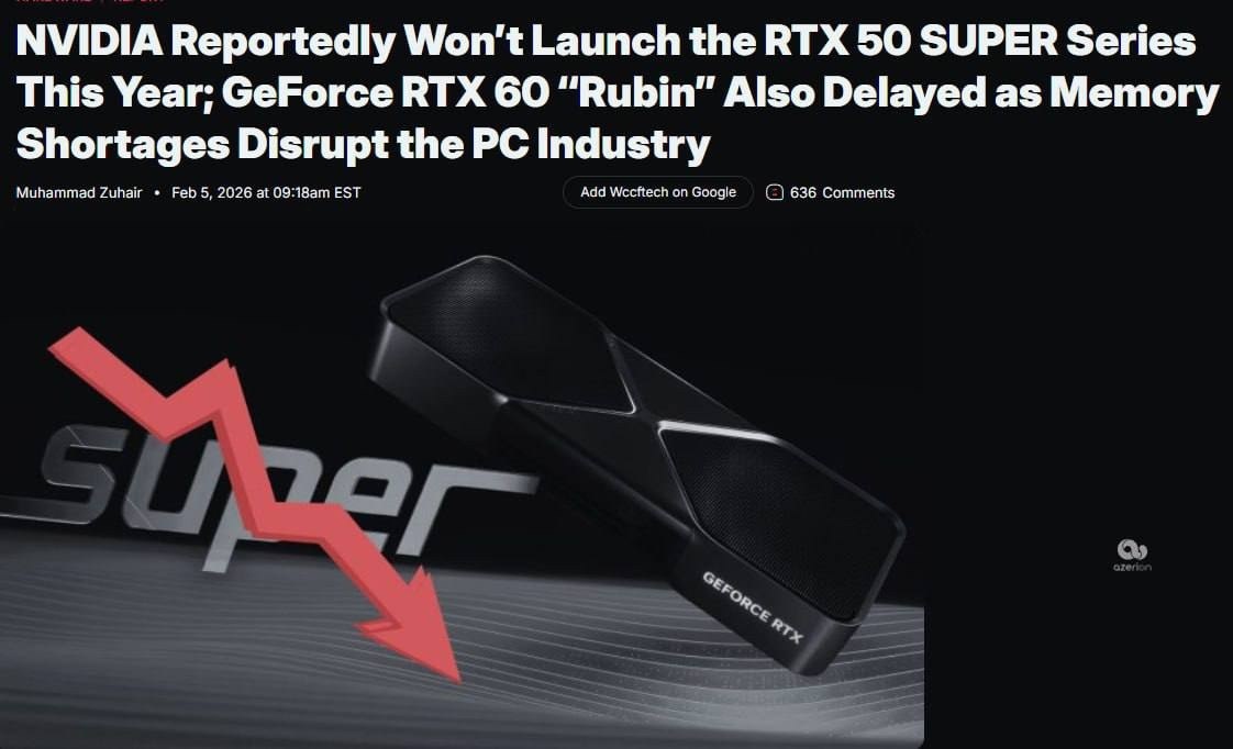 Причина в двух ключевых факторах: во‑первых, возник острый дефицит чипов памяти, особенно стандарта GDDR7. Во‑вторых, компания пересмотрела приоритеты и теперь сосредоточена на производстве ускорителей для искусственного интеллекта. Этот сегмент приносит уже до 90 % выручки Nvidia, тогда как доля игрового направления сократилась до скромных 7,5 %. Из‑за этого отменён релиз серии RTX 50 SUPER. Кроме того, производство видеокарт линейки RTX 50 сократят на 30–40 %, что с высокой вероятностью приведёт к их дефициту на рынке и росту цен. Ещё более заметное последствие — серьёзная задержка выхода следующего поколения видеокарт RTX 60 (Rubin): теперь их появление ожидается не раньше 2028 года. Единственной новинкой от Nvidia в 2026 году станут процессоры N1 и N1X. Они построены на ARM‑архитектуре и ориентированы на решение ИИ‑задач в ПК и ноутбуках. Таким образом, в 2026 году гей Показать полностью... Dailyhardcore Подписаться