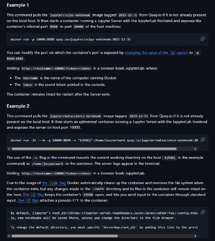 вычислений. Позволяют легко развернуть Jupyter Server или JupyterLab в контейнере Docker, как для личного использования, так и для командной работы через JupyterHub. 📌 Основные особенности: 🔵Запуск личного сервера Jupyter с интерфейсом JupyterLab (по умолчанию). 🔵Использование JupyterLab для команды через JupyterHub. 🔵Запуск Jupyter Notebook в локальном Docker-контейнере. 🔵Создание собственных Docker-образов на основе этих стэков. ➡️Установка и использование: docker pull jupyter/base-notebook docker run -p 8888:8888 jupyter/base-notebook 📱 Репозиторий ⚙️ Документация ➡️Справочник Программиста. Подписаться