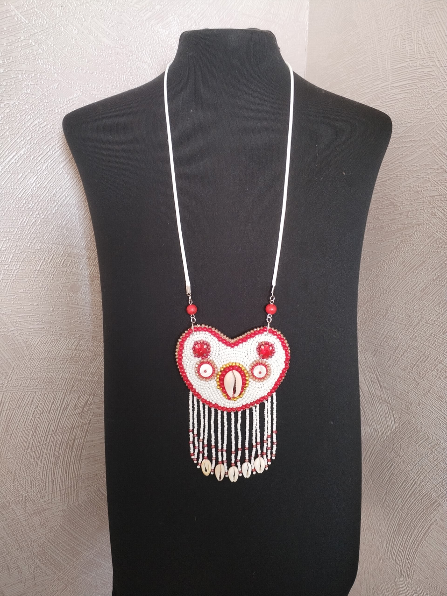 • Детали: объёмная вышивка бисером, аккуратная окантовка в красно‑белой гамме и элегантные ниспадающие кисточки — эффектный акцент на