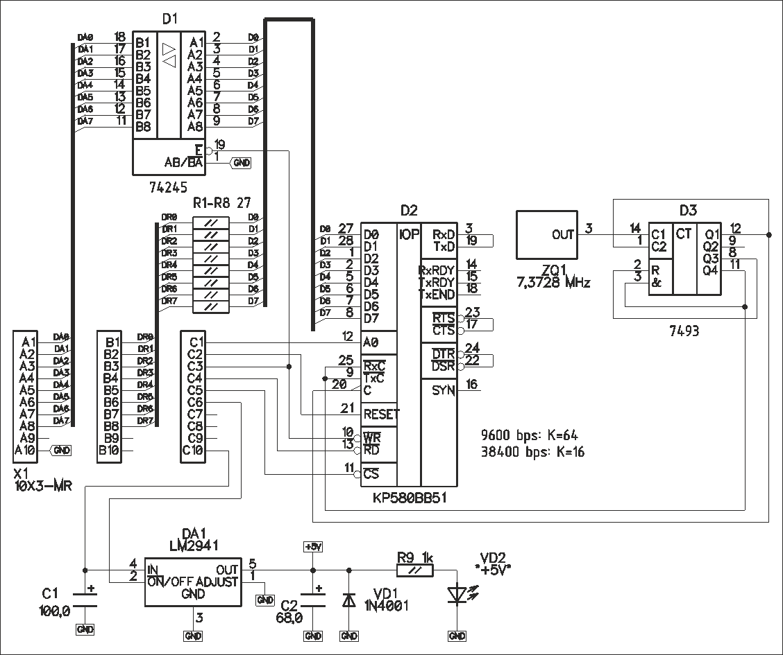 Всех приветствую! В предыдущей статье рассматривался тестер микросхемы КР580ВИ53. Как описывалось ранее, ВИ53 используется для тактирования ВВ51 и эти микросхемы обычно используют в паре. Но если использовать только одну скорость или, например, как в описываемом случае, две - 9600 и 38400, то можно обойтись и без ВИ53, используя тактовый генератор на счётчике К155ИЕ5, построив на нём делитель частоты на 6 и переключаясь между скоростями программно. Для проверки микросхемы КР580ВВ51 был разработан вот такой простой тестер: Тестирование заключается в передаче данных обратно в микросхему, а также передача управления контроля приёмо-передачей через управляющие выводы /RTS-/CTS и /DTR-/DSR на аппаратном уровне, которыми управляет сама микросхема. Как видно из схемы, тактирование происходит отдельным генератором без применения КР580ВИ53. При этом для работы доступны две скорости: 9600 и 38400. Переключение между ними происходит программно. Счётчик тактируется кварцевым генератором частотой 7