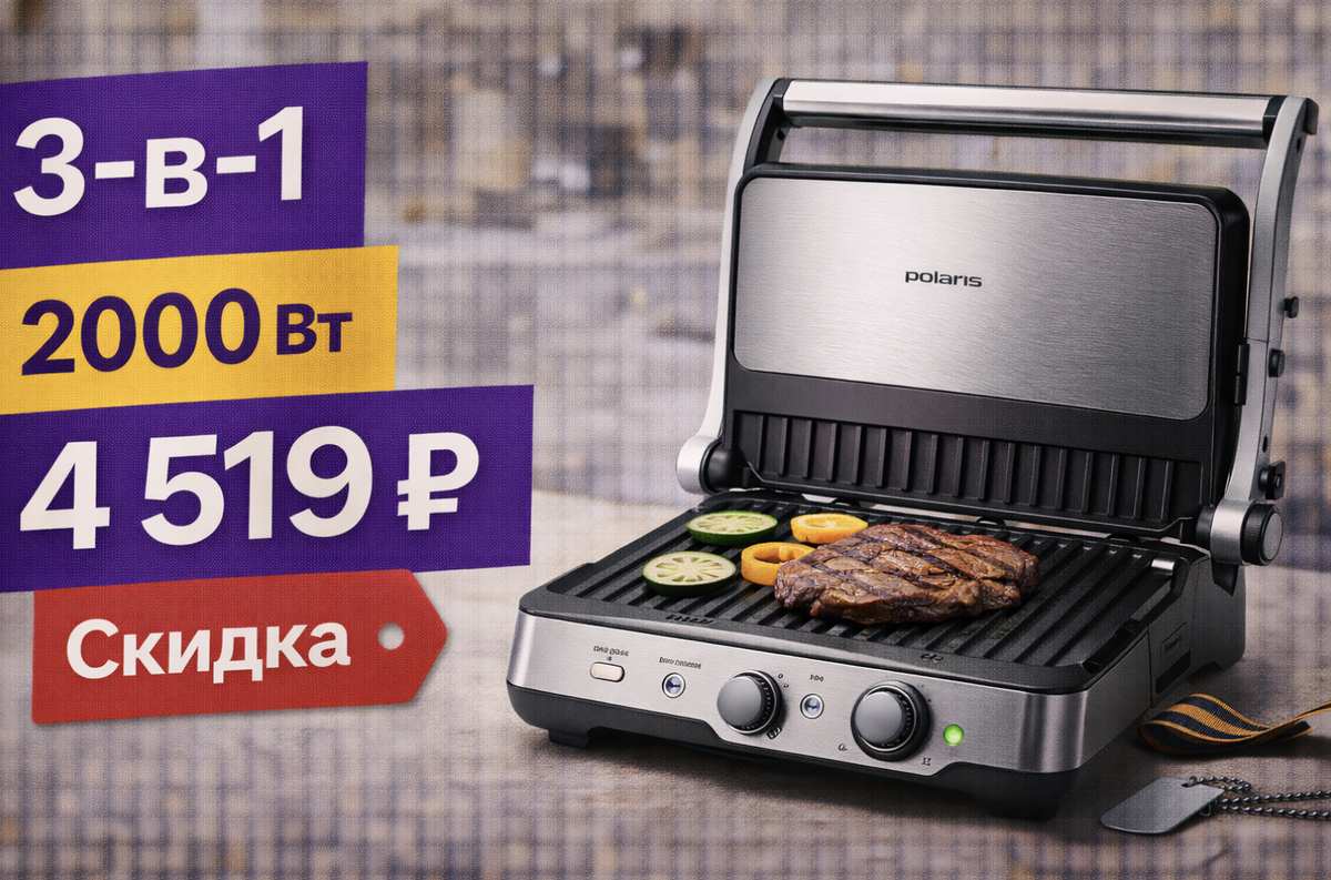 А есть такая, которая реально начинает работать каждый день: быстрые завтраки, тёплые сэндвичи, мясо/рыба/овощи без дыма и без сковороды. Polaris PGP 2302D “3 в 1” — как раз про второй вариант. Это электрогриль на 2000 Вт с антипригарным покрытием и форматом “3 в 1”, который обычно означает несколько режимов использования (например, закрытый гриль/открытый как две панели/прижимной режим — зависит от конкретной модели и механики крышки). Цена сейчас 4 519 ₽ вместо 14 999 ₽ — скидка сильная, поэтому разберём, кому он зайдёт и что проверить перед оплатой. Электрогриль — это когда: Без брызг, без дыма “как от сковороды” и без стояния у плиты. Чем выше мощность, тем лучше гриль держит температуру, особенно когда кладёте холодное мясо/курицу/овощи.