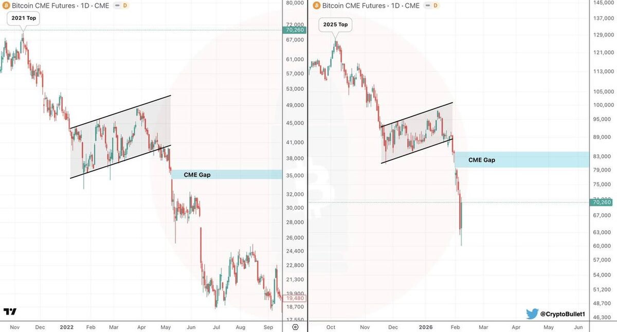 История уже это показала Сейчас многие зацепились за CME гэп по биткоину в районе ~$84k и мыслят линейно: «рынок обязан туда вернуться и закрыть его как можно быстрее». Это опасное упрощение. Посмотрите на левую часть картинки. Май 2022 года. CME гэп около $35k. Тогда тоже звучало ровно то же самое: «обязательно закроем, вопрос времени». Факт в том, что этот гэп не был закрыт больше года. Цена ушла значительно ниже, прошла полный медвежий цикл, и вернулась к нему только в октябре 2023. Что из этого следует. CME гэпы — это не магниты с дедлайном. Это зоны интереса, которые рынок может закрыть, а может оставить открытыми на месяцы и даже годы, если структура цикла этому не способствует. Сейчас рынок находится в фазе, где: — инерция после пика ещё не отработана — ликвидность снижается — ожидания толпы опережают реальность И в таких условиях ставка «обязаны срочно закрыть гэп» — это ставка на надежду, а не на структуру. К чему это приведёт? К тому, что часть инвесторов будет прежд