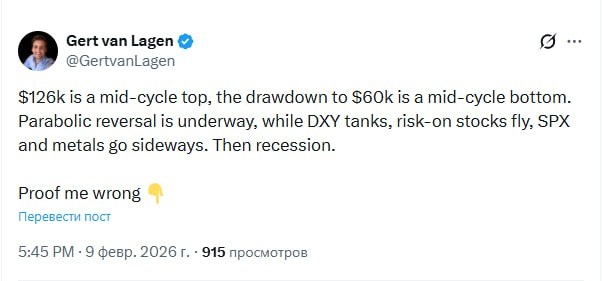 $126 000 — это вершина середины цикла, а снижение до $60 000 — его дно. Начинается параболический разворот: индекс доллара (DXY) падает, рисковые акции растут, S&P 500 и металлы движутся вбок. Затем — рецессия.