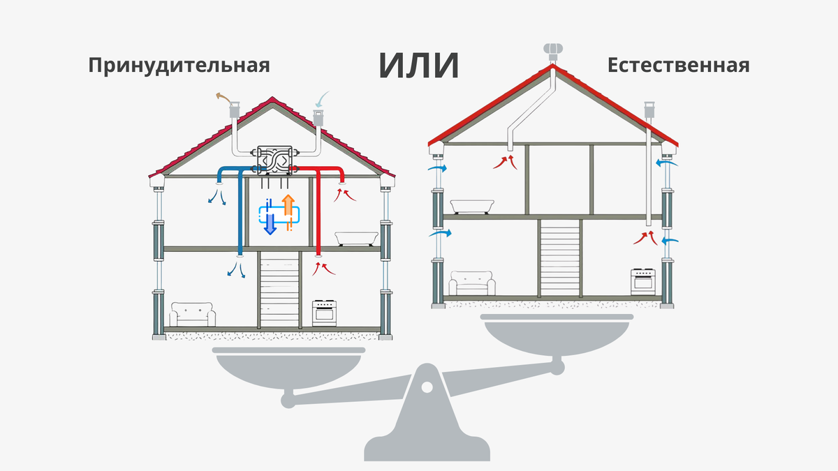 Естественная вентиляция работает за счёт перепада температур и тяги, но она нестабильна: зависит от погоды и времени года.