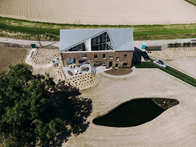 Дом на склоне с дворами и зелёной крышей у реки в Польше