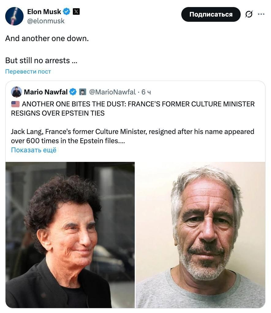 ✅ Жак Ланг, бывший министр культуры Франции, подал в отставку после того, как его имя появилось более 600 раз в файлах Эпштейна. 💲Он и его дочь сейчас находятся под следствием по делу о «отмывании налогового мошенничества в крупном размере», связанному с офшорными сделками с Эпштейном». ✅ Илон Маск: ❗🗣️«И ещё один пал. Но арестов всё ещё нет…» Сальное Дифлопэ