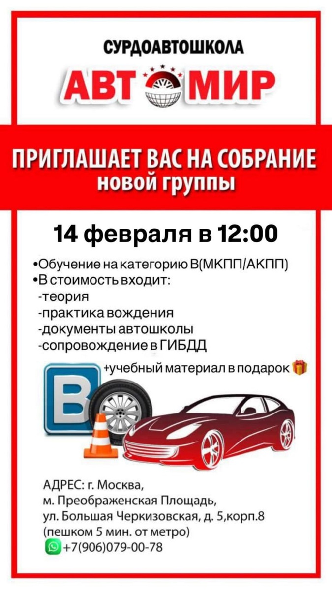🏙🏙🏙🏙 🤲🤝✊✌️🫵🫶 🔜 Автошкола для глухих приглашает на учёбу 🚗 Сурдоавтошкола "АвтоМир" приглашает людей с нарушением слуха на обучение категории В (автомобиль до 3,5 тонн). 🗓 Собрание 14 февраля в 12:00. ✅ Обучение в классе по субботам с 10:30 до 14:00. 🚦🚘 Адрес: г. Москва, ул. Большая Черкизовская, д.5, корп.8 (м. Преображенская Площадь, 5 минут пешком от метро) 📱 +79060790078. Эти и другие новости - на @gluxixnet.