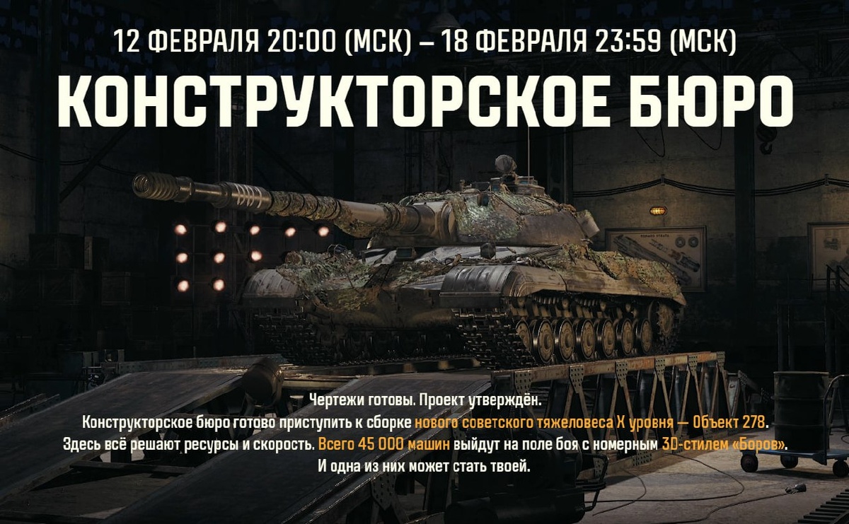 ) - Конструкторское бюро с новым советским ТТ X уровня — Объект 278 🔸Количество машин ограничено. Для сборки доступно 45 000 танков с номерным 3D-стилем «Боров» и ещё 100 000 — в стандартной комплектации. 🔸На получение Объекта 278 в стандартной версии есть 6 дней. 🔸Номера присваиваются последовательно — от меньшего к большему. При этом Конструкторское бюро может закрыться досрочно, если все машины будут собраны. 🥳 Калькулятор для расчета необходимых ресурсов ➡️ ЗДЕСЬ