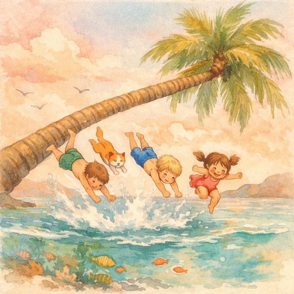 Вода в океане была просто волшебной, а некоторые пальмы нагибались так низко к воде, что почти касались её верхушками. Ребята придумали классную игру! Они выныривали из океана, цеплялись за ствол пальмы, забирались повыше и с громким криком «Бульк!» плюхались обратно в воду. Брызги летели во все стороны, и они визжали от восторга! Это было так здорово!