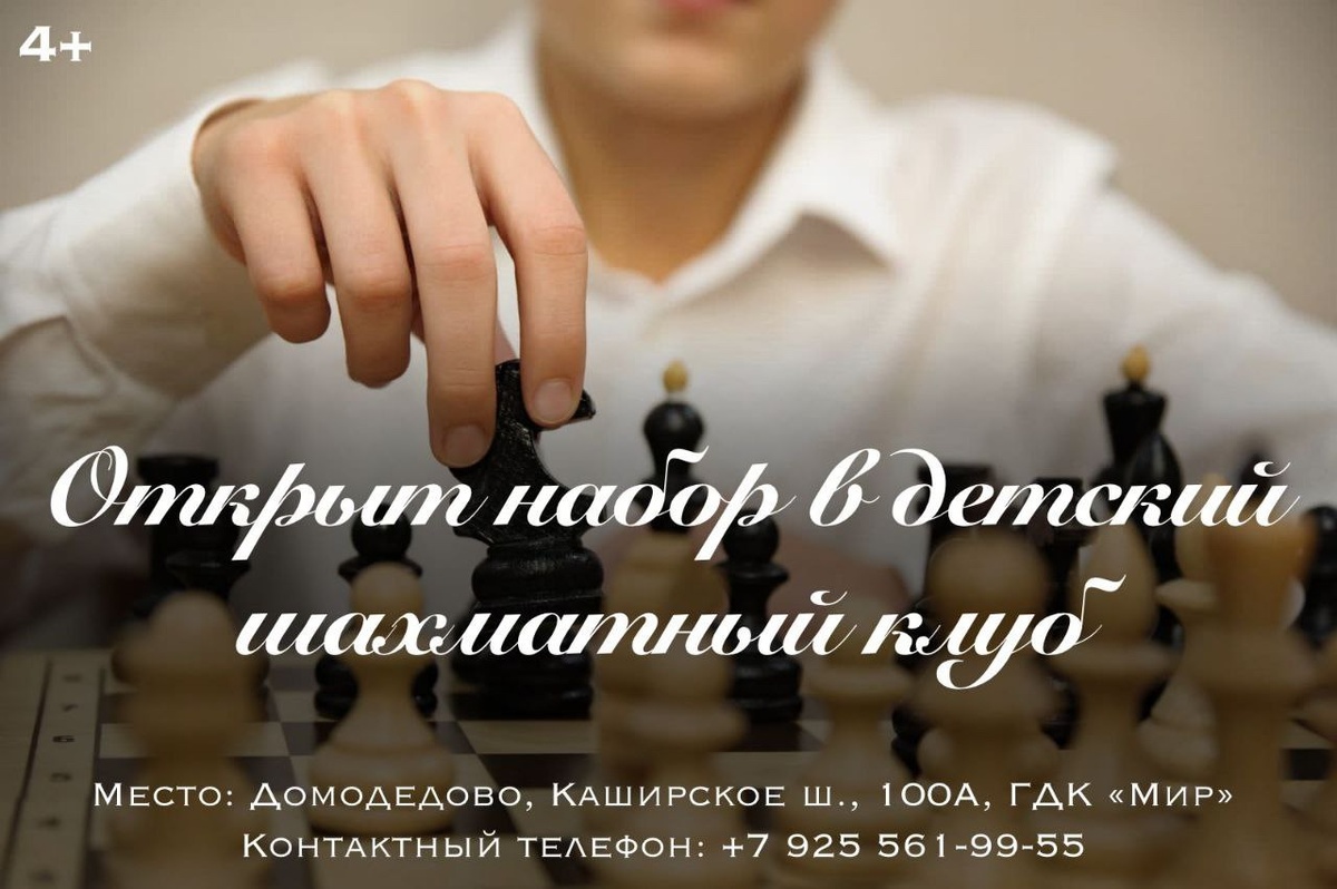 ✨ Замечательная новость! Шахматная школа «Белая ладья» объявляет набор детей от 4 лет. Шахматы для детей – один из лучших способов развить у ребенка сообразительность, логику и фантазию. Приглашаем всех ребят, желающих окунуться в бесконечно интересный мир этой древней игры. Шахматы развивают логическое мышление и изобретательность. Тренируют усидчивость и дисциплинированность. Учат самостоятельности выбора и умению добиваться своих жизненных целей. Услуга платная. Тел. +7 925 561-99-55 🏢 Дворец культуры и спорта «Мир» 📍 г. Домодедово, Каширское шоссе, д.100А ✅ Мероприятия Домодедово https://dzen.ru/id/66f10385cc4c5a16f7b5fb02 http://vk.com/domodedovo_events http://dzen.ru/domodedovo_events