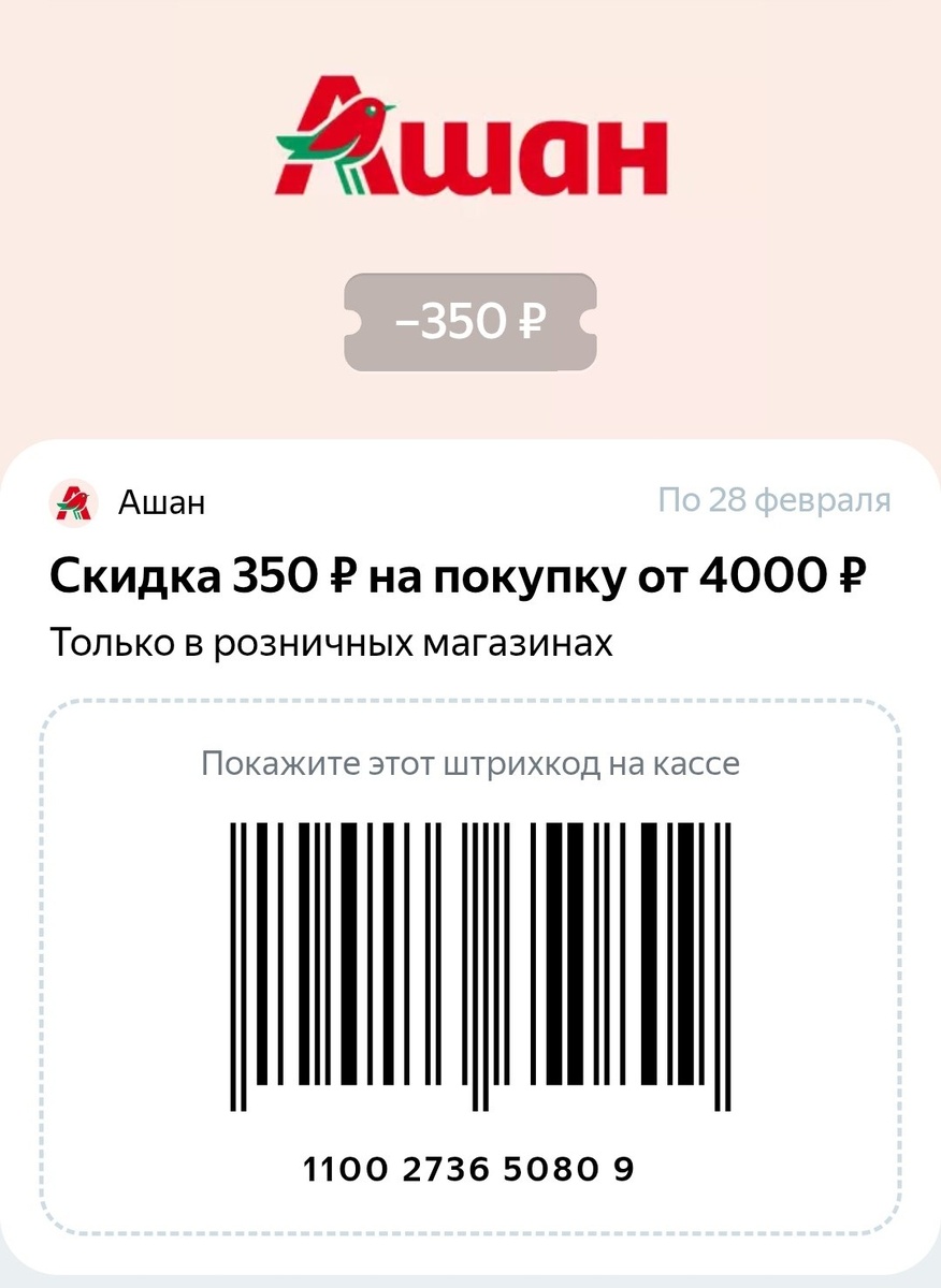 Скидка 350 рублей в магазине Ашан на кассе, при покупке от 4000 рублей, покажи кассиру на кассе или отсканируй.