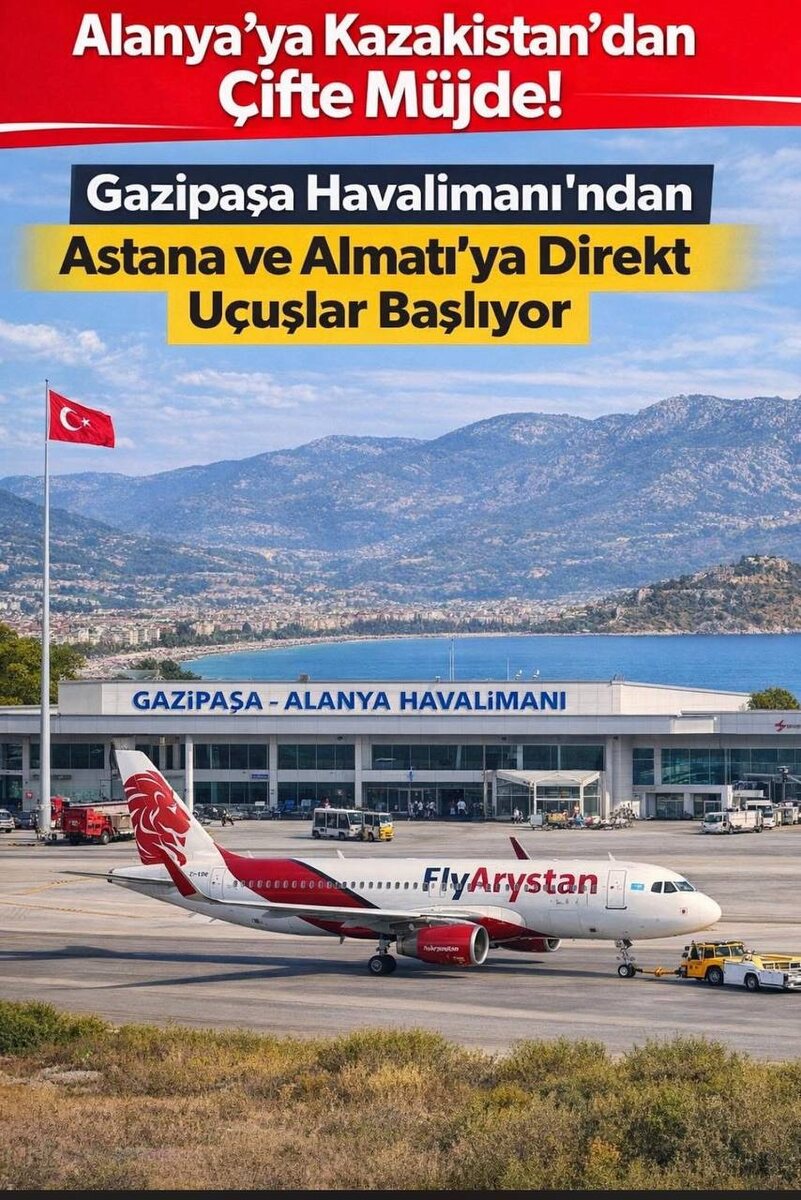 🇰🇿 Казахстанская авиакомпания FlyArystan приняла важные решения для аэропорта Газипаша-Алания летом 2026 года. Возвращаются рейсы Астана-Аланья 🛫 Линия Алматы-Алания впервые открывается 🛫 Новыми прямыми рейсами Аланья будет соединена авиакомпанией с двумя крупными городами Казахстана✅ Ожидается большой вклад в туризм региона🏖️