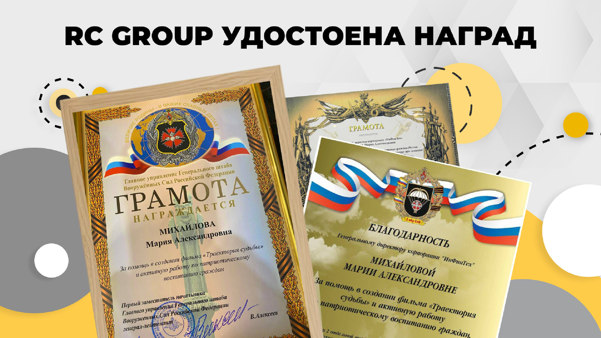Компания RC GROUP и ее генеральный директор Мария Михайлова удостоены престижных наград за активное участие в производстве документального фильма «Траектория судьбы», а также за системную деятельность в сфере патриотического воспитания граждан России. Признание получено от ведущих военных структур страны.