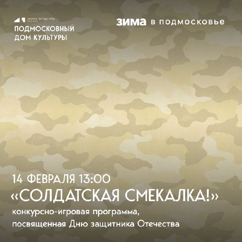 ✨ Впереди насыщенные выходные выходные ✉️ Конкурсно-игровая программа «Солдатская смекалка»! 📆 14.02.2026🕒13:00 🏢 Подмосковный сельский дом культуры (СДК) 📍 г.о.Домодедово, пос.санатория Подмосковье, д.9 ✅ Мероприятия Домодедово https://dzen.ru/id/66f10385cc4c5a16f7b5fb02 http://vk.com/domodedovo_events http://dzen.ru/domodedovo_events