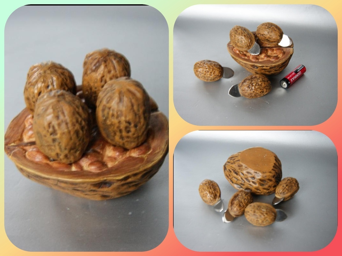1. Этот предмет родом из Испании, как видите, он совсем небольшого размера, если точнее, то от основания высота 4 см. Диаметр — 9 см. А сами орешки с лезвиями по 3 см. Вопрос: для чего это нужно?