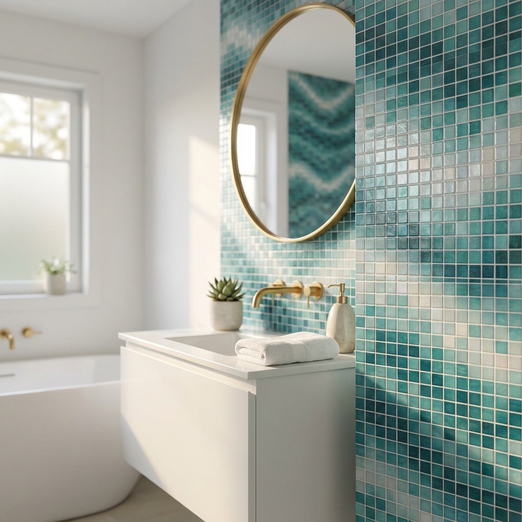 Четвёртое направление — создание акцентных зон. Необязательно полностью переделывать ванную комнату. Достаточно выложить мозаичной плиткой одну стену или нишу. Настенная мозаика превращает обычный санузел в спа-зону за выходные.