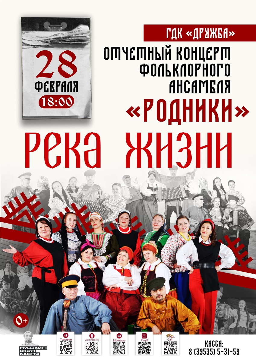 Этот концерт - отражение развития ансамбля «Родники»: от истоков, через яркие моменты роста и зрелости, и заканчивая осознанием важности сохранения культурных традиций и наследия предков. Руководитель коллектива - Марина Жмурова. "Родники" - это коллектив, который влюбляет в народную традицию и оставляет в сердце каждого человека незабываемые эмоции. В тандеме с хореографическим ансамблем "Этна" (руководитель Оксана Гимранова) концерт никого не оставит равнодушным. Приходите, чтобы насладиться великолепным вокальным исполнением и захватывающей хореографией! Билеты в кассе ГДК "Дружба": 8(395-35)-5-31-59 и онлайн: https://clck.ru/337GuN Действует Пушкинская карта!
