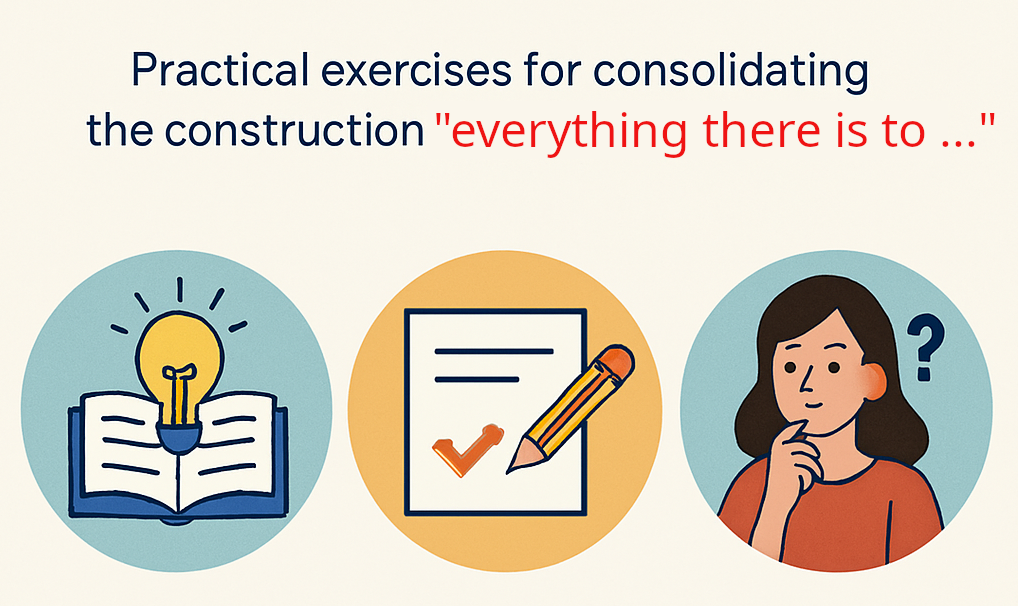 Практические упражнения для закрепления конструкции “everything there is to ...” Эта универсальная конструкция означает «всё, что только можно / что существует для...». Она помогает выразить полноту действия или знаний. Чтобы запомнить её лучше, давайте сразу перейдём к практике. (Смотрите теоретический материал в предыдущей статье) Exercise 1. Complete the sentences with the correct form of the verb (to know / to see / to do / to eat / to say). 1. My grandfather is a master carpenter; he taught me ________________ about working with wood. 2. We only have 24 hours in Rome, but we're determined to see ________________ in the historic center. 3. I've argued with him for hours. I think I’ve said ________________ on the matter. 4. The new interactive museum is fantastic for kids. There's ________________ there! 5. At the street food festival, wetried ________________ from Korean tacos to Spanish paellas. Exercise 2: Translate these sentences intoEnglish using the "everything thereisto..."