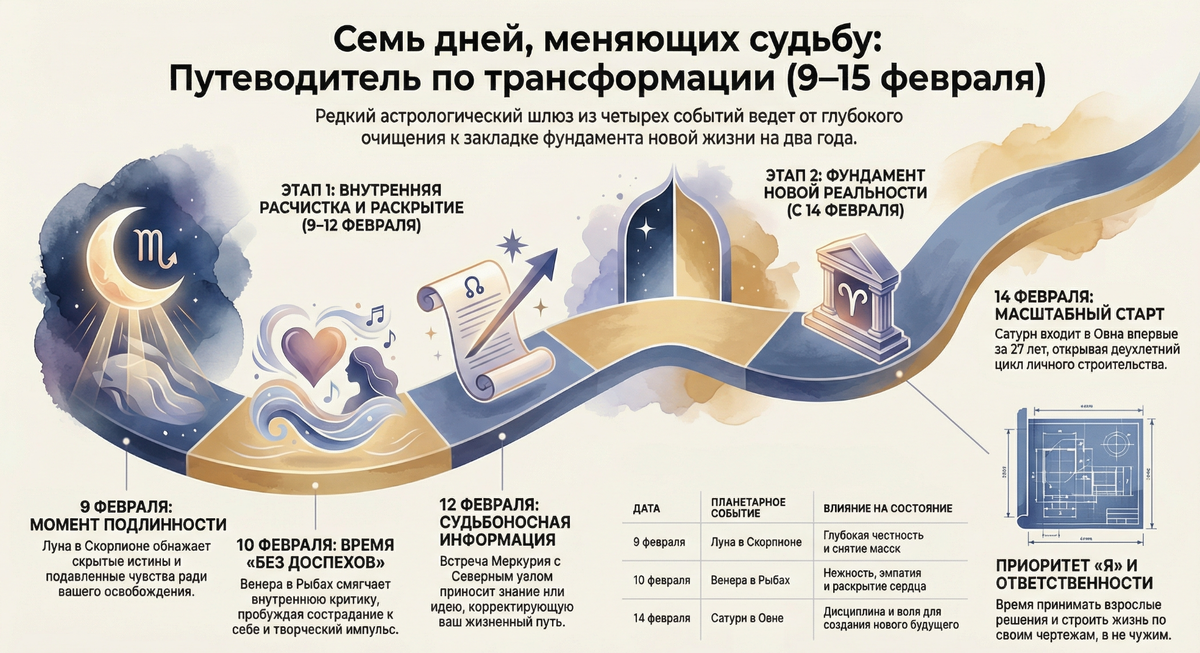 Семь суток. Четыре мощнейших сдвига. Одна граница, после которой возврата не будет. Когда 15 февраля закончится, вы обнаружите себя в другой точке. Давайте пройдём по этой неделе день за днём, чтобы вы понимали, к чему готовиться и как использовать этот редкий шанс максимально.