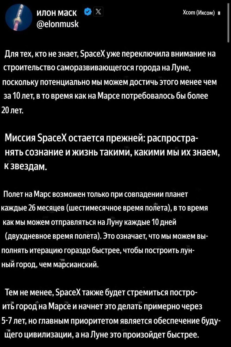 Илон Маск максимально усилил свое присутствие в космической отрасли, сложно поверить, что он позволит НАСА распределять умопомрачительные бюджеты между другими компаниями. Согласно оценке Управления генерального инспектора NASA): · Стоимость первой миссии SLS/Orion составляла 4,1 млрд долларов. · Из них: 2,2 млрд — на создание одной ракеты SLS (основной подрядчик — Boeing), 568 млн — на наземные системы, 1 млрд — на корабль «Орион» (разработчик — Lockheed Martin), 300 млн — на его сервисный модуль (разработчик — Airbus). · Northrop Grumman, производитель твердотопливных ускорителей (дающих почти 80% начальной тяги), также получает значительную часть финансирования. Допустить, что эти средства продолжат течь мимо SpaceX, — значит совсем не знать Илона Маска. Я по-прежнему считаю, что его цель — стать основным, а по возможности и единственным, техническим подрядчиком НАСА в деле освоения других миров. Так что же это значит для миссии «Артемида»? Думаю, ближайший полет, который уже два