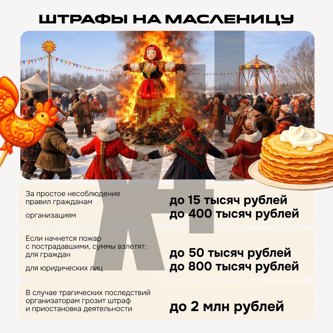 Специального штрафа за сам обряд нет, но есть суровое наказание за нарушение правил пожарной безопасности. Заплатить за нарушение можно до 400 тысяч рублей. Масленица не за горами, в этом году праздник пройдет 16 февраля. А вы будете жечь на масленицу? 🔥 — конечно! 😁 — пока жгу только дедлайны. Подписаться | Прислать новость | Дать «буст» | Мы в MAX