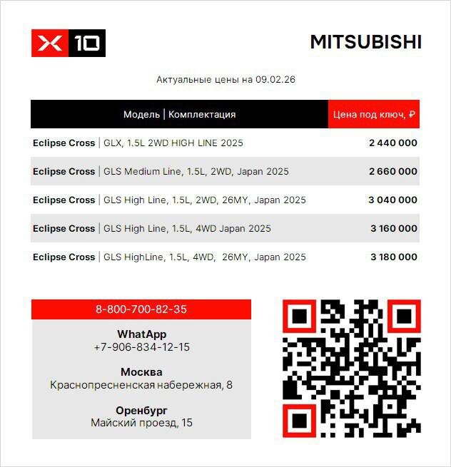 ) 🟢Подробности комплектации Medium Line 🟢Обзор комплектации High Line 2WD (2025) 🟢Обзор комплектации High Line 4WD (2025) 🤑 Цены указаны с учётом растаможки и доставки в Москву. Дополнительные вопросы по прайсу или комплектациям можно уточнить у специалистов: 📞 8 800 700-82-35 🤩.market 📞 8 919 868-97-47 Иван 📞 8 922 856-66-66 Сергей (авто из Кыргызстана) 💬 WhatsApp 💬 Telegram 💙 Сообщество в VK 🖥 Сайт 📍Оренбург, проезд Майский, 15 📍Москва, Краснопресненская набережная, 8 #x10прайс #mitsubishieclipsecross
