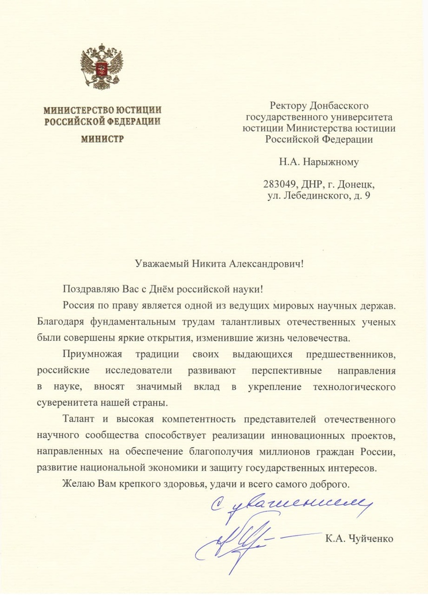 🤝 Министр юстиции Российской Федерации Константин Анатольевич Чуйченко поздравил ректора Донбасского государственного университета юстиции Никиту Александровича Нарыжного с Днем российской науки.